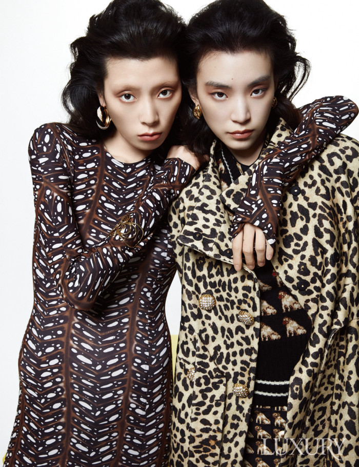 (왼쪽) 레오퍼드 패턴을 재해석한 저지 드레스는 페라가모. 진주와 브라스를 세팅한 후프 이어링은 셀프포트레이트. 모노그램 플라워 커프 브레이슬릿은 루이 비통. (오른쪽) 레오퍼드 패턴 코트와 강아지 프린트 드레스, 베스트 모두 발렌티노. 조개 모양의 이어링은 펜디.