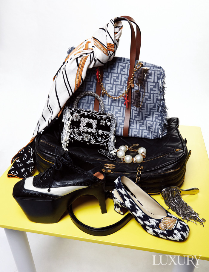 FF 데님 프린지 토트백과 불가사리 장식의 백 참 모두 펜디. 코튼 스카프는 루이 비통. 금장 로고를 더한 선글라스는 미우 미우 by 에실로룩소티카. 갖가지 보석으로 장식한 미니 토트백과 브랜드 로고 헤어핀 모두 로저 비비에. 진주 브레이슬릿은 돌체앤가바나. 퀼티드 블랙 더플백은 샤넬. 오버사이즈 플랫폼 로퍼와 빗 모양의 메탈 브로치 모두 맥퀸. 하운즈투스 펌프스는 발렌티노 가라바니.