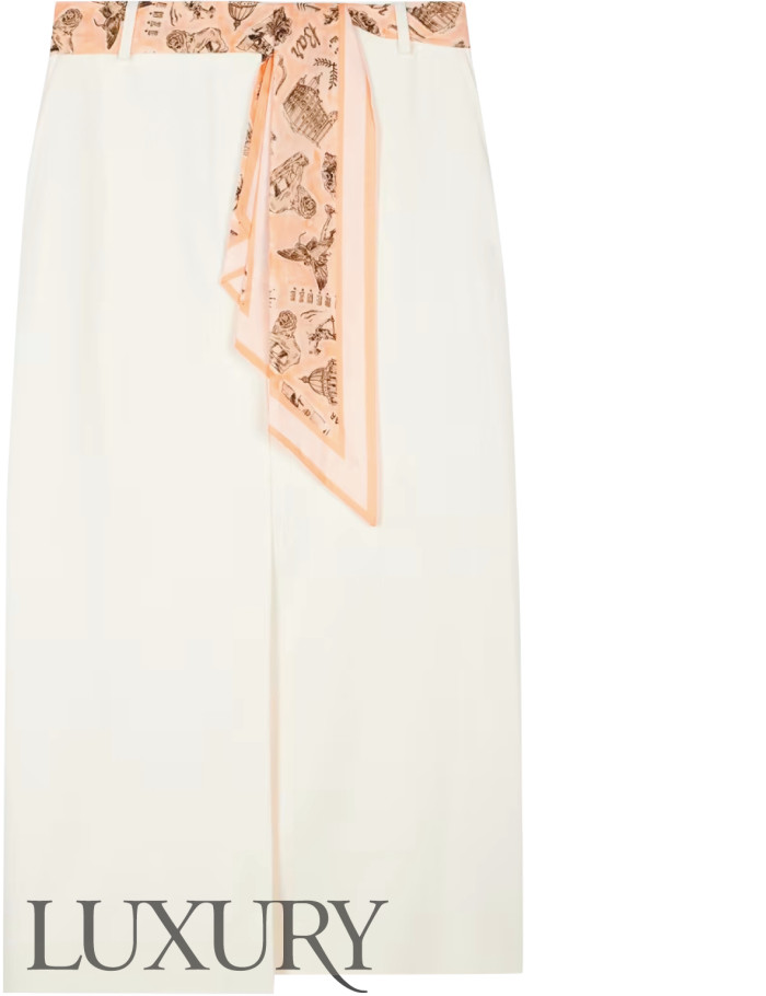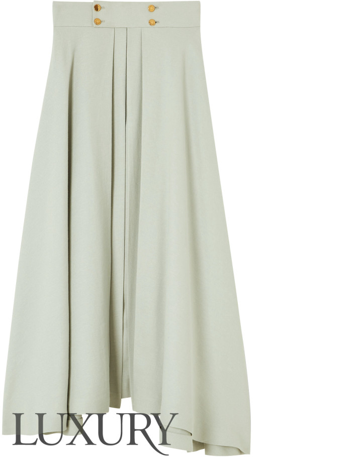 플레어 디테일과 4개의 골드 버튼으로 완성한 스커트. 주름이 잘 생기지 않는 마감 기법을 적용했다. 로로피아나.