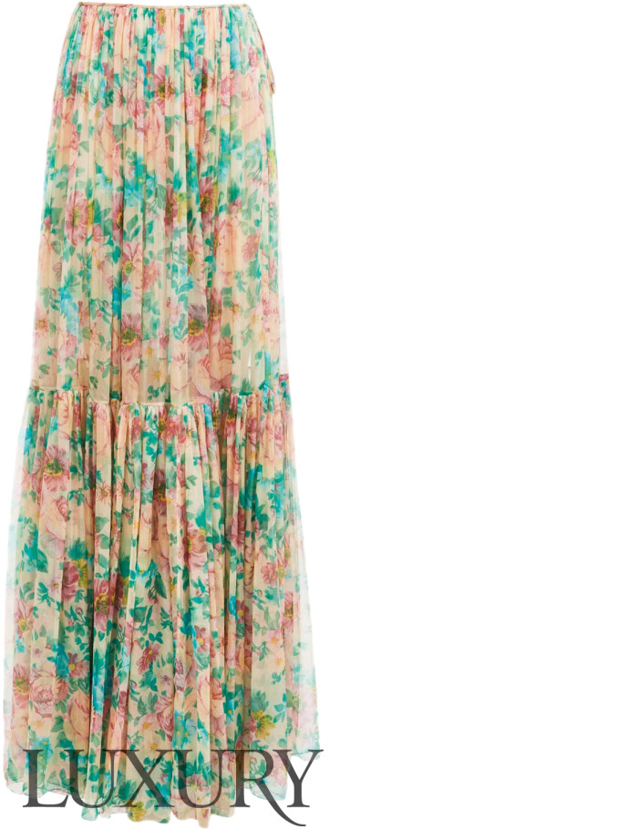 화사한 플로럴 프린트가 돋보이는 티어드 스커트. 하늘하늘한 실크 소재로 제작했다. 끌로에.