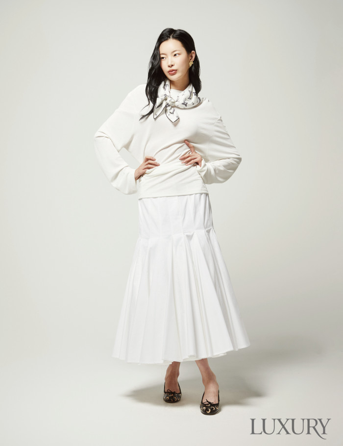자연스러운 주름이 돋보이는 저지 톱과 플리츠 디테일의 미디스커트 모두 자크뮈스. 골드 이어링은 페라가모. 모노그램 스카프는 루이 비통. 반달 프린팅 펌프스는 마린 세르×레페토.