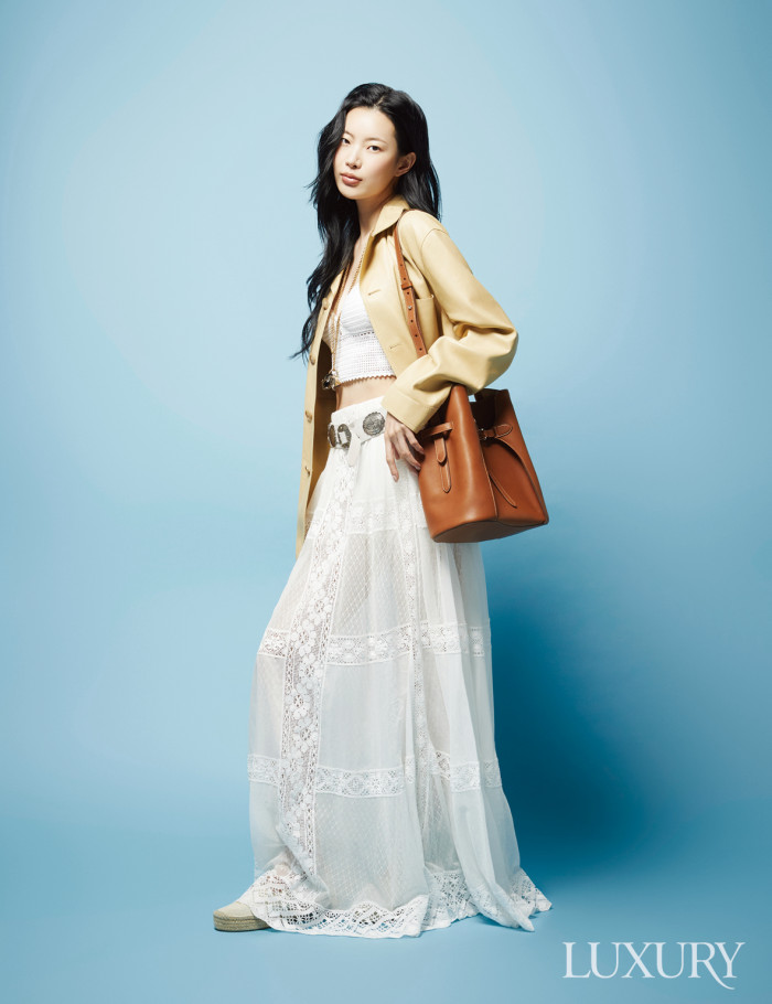 싱글 버튼 레더 재킷과 니트 뷔스티에, 시스루 레이스 스커트, 베이지색 에스파드리유, 버클 디테일의 숄더백 모두 랄프 로렌 컬렉션. 펜던트 네크리스는 끌로에.