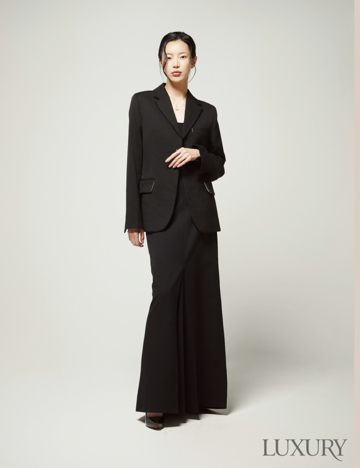 블랙 테일러드 재킷과 슬림 핏 스커트 모두 빅토리아 베컴 by 10 꼬르소 꼬모 서울. 반달 펜던트 네크리스와 오픈 링 모두 스와로브스키. 스틸레토 힐은 메종 마르지엘라. 블랙 이너 톱은 에디터 소장품.