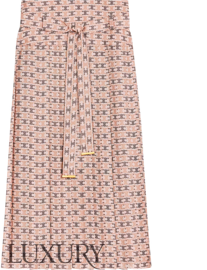 치마 전체에 아이코닉한 트리옹프 로고를 새긴 플리츠스커트. 허리 리본 디테일도 더했다. 셀린느.