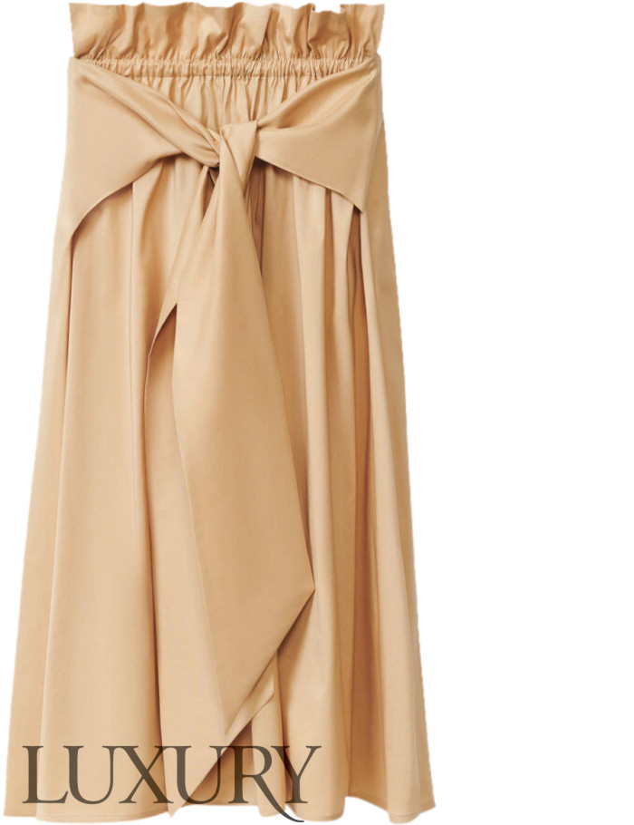 허리 밴딩 디테일과 리본 벨트로 잘록한 허리선을 강조한 포플린 스커트. 파비아나 필리피.