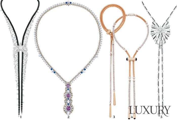 가슴을 따라 자연스럽게 흘러내리는 Y자 형태의 래리어트lariat 네크리스. 카우보이들이 쓰는 올가미 형태의 밧줄을 뜻하는 단어 ‘라 레아타la reata’에서 유래했다. 1920년대 아르데코 디자인에서 시작되어 보헤미안 스타일과 결합한 후, 오늘날 간결하고 세련된 형태로 재탄생해 주얼리계의 중심에 다시 섰다. 주얼리가 패션을 보조하는 아이템의 영역을 뛰어넘어 패션의 중요한 일부가 되고 있다는 증거다.