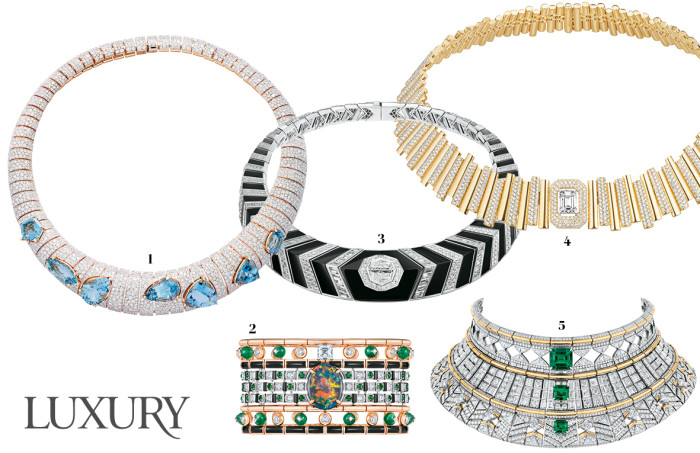 5 네크라인에 볼드하게 밀착되는 ‘버츄오시티 마에스트리아’ 네크리스. 다양한 디자인의 다이아몬드가 완벽하게 계산되어 들어맞는 형태미가 아름답다. 루이 비통.