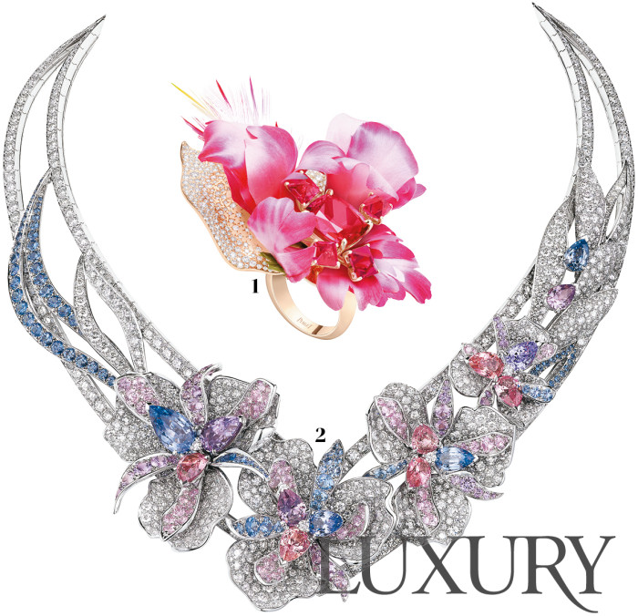 1 꽃잎 중앙에 쿠션 컷 레드 스피넬을 세팅한 ‘엑스트라오디너리 로즈’ 링. 깃털 장인 넬리 소니에의 손맛이 만나 부드러운 꽃잎의 질감을 구현했다. 피아제.