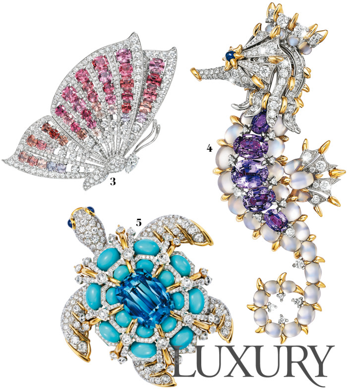 5 바다의 색감을 닮은 아콰마린과 튀르쿠아즈 장식으로 바다거북의 조형적인 등딱지를 표현한 ‘블루 북’ 컬렉션의 ‘바다거북’ 브로치. 입체적인 볼륨과 텍스처를 통해 깊고 신비로운 해저 세계를 탐험하는 듯한 느낌을 준다. 티파니.