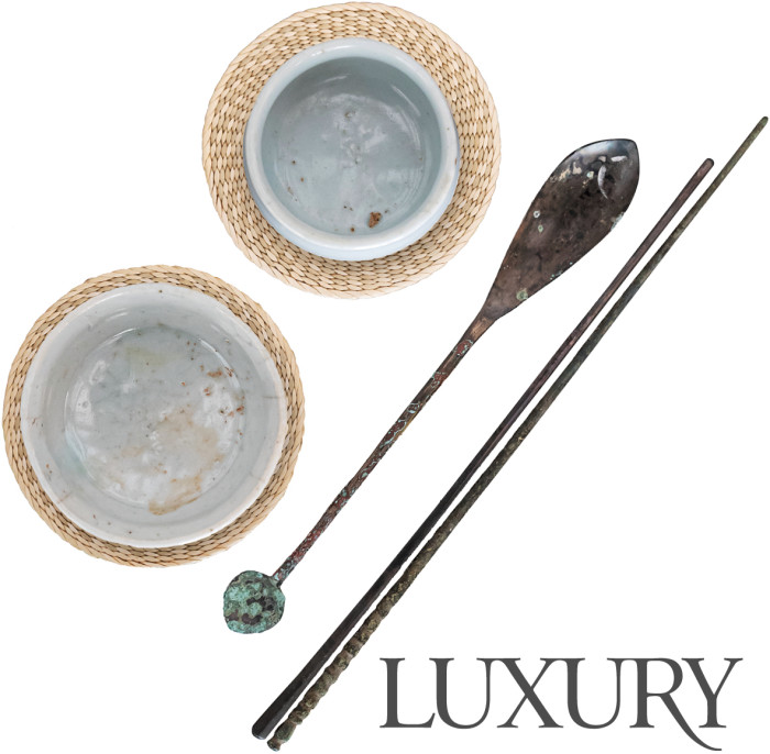각기 다른 모양으로 만들어진 조선 시대의 백자 물잔들. 그리고 고려 시대에 약을 먹을 때 쓰던 청동 약 수저와 젓가락. 짝이 맞지 않는 게 더 재미있다.