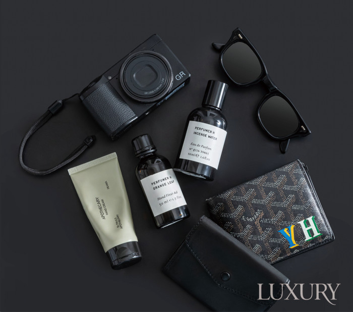 그의 주머니 속에서 나온 것들. 계절의 향을 직관적으로 담은 영국 브랜드 퍼퓨머 H의 향수들과 고미술품을 자주 만지는 손을 보호할 어퍼서케리 핸드크림, 선글라스와 카메라 그리고 명함 지갑과 지갑.