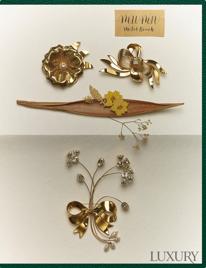 플라워와 보 셰이프의 브로치 모두 미우 미우.