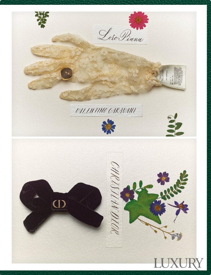 (위부처) ‘V 로고 시그너처’ 글러브는 발렌티노 가라바니. 볼드한 링은 로로피아나. 벨벳 소재의 보 장식 핀은 디올.