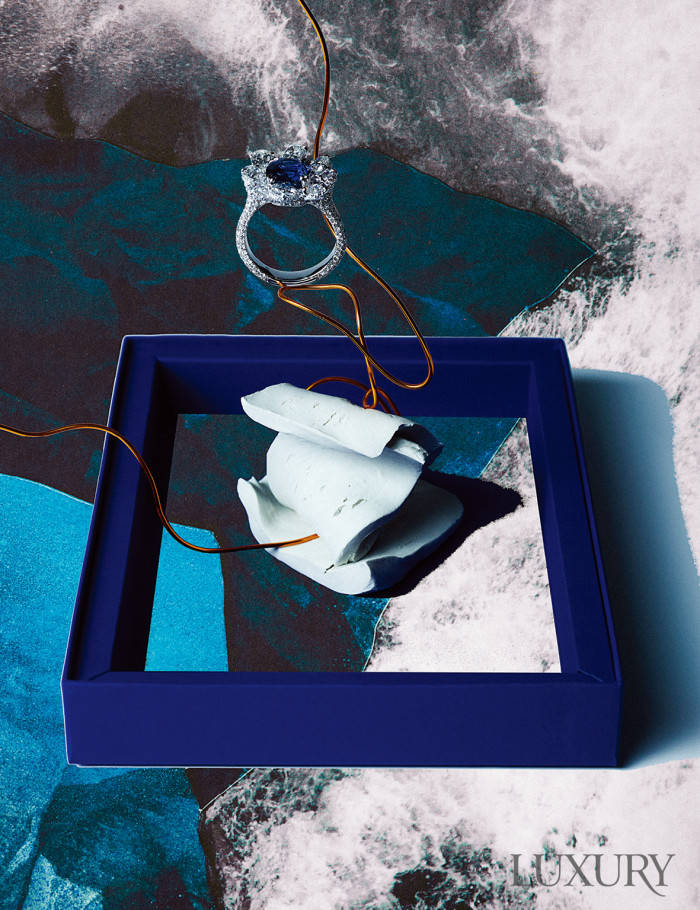 변화무쌍한 대자연은 경외와 모사의 대상이다. 깊은 심해의 색을 담은 4.51캐럿의 사파이어와 부서지는 파도를 연상케 하는 역동적인 다이아몬드 세팅의 ‘젬 D’ 링은 다미아니.