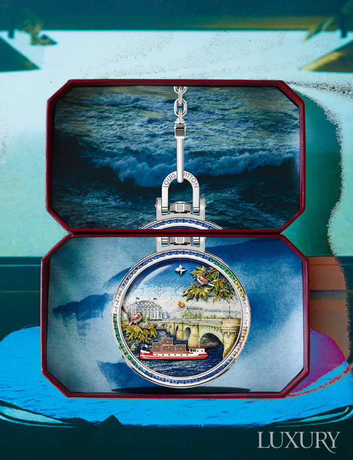 이색이 넘치는 도시로의 여정은 완벽한 서사로 승화되곤 한다. 메종의 상징인 트렁크가 가득 실린 배가 메종의 근원지인 파리 퐁뇌프 다리 근처로 다가오는 모습을 섬세하게 조형한 ‘에스칼 오투르 뒤 몽드 에스칼 오 퐁네프’ 포켓 워치는 루이 비통.