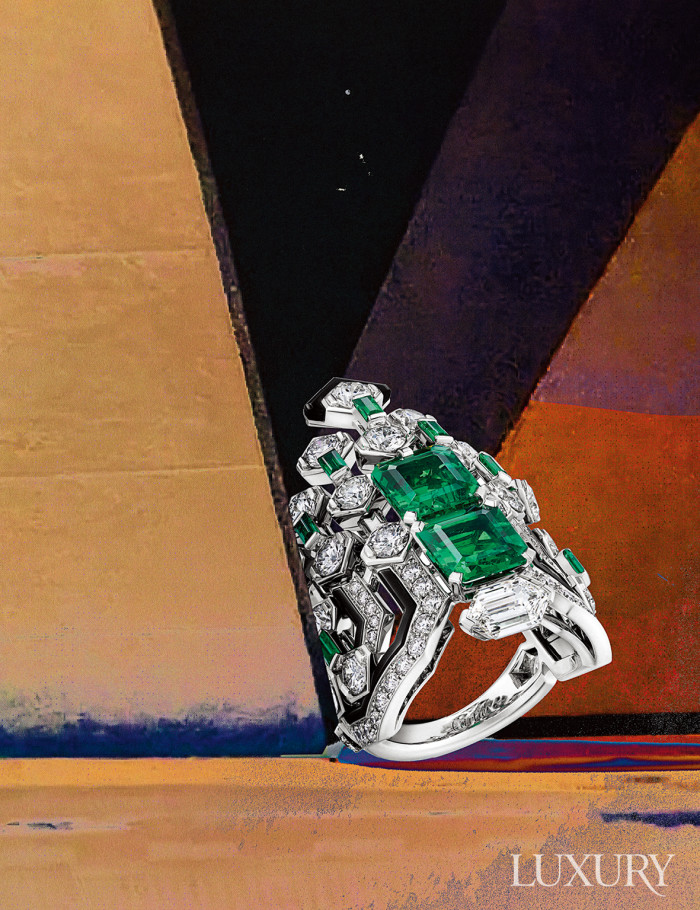 건축적 조형미는 원석을 다듬고 배열하는 데 지대한 영감을 준다. 기하학적인 오픈워크 구조에서 콜롬비아 에메랄드가 중심을 형성하며 블랙과 화이트, 그린의 메종 시그너처 색상 조합이 강렬한 볼륨과 색상의 균형을 상징한다. ‘앙 에킬리브르 하이주얼리 트라포라토’ 링은 까르띠에.