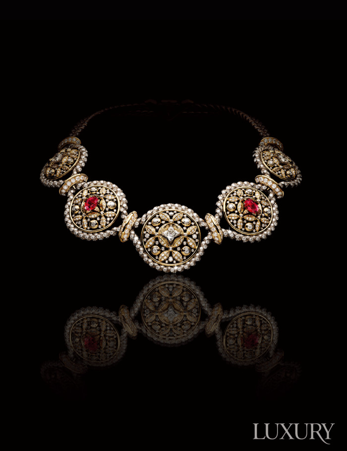 신성한 수호자 ‘프로텍션Protection’  탁월한 품질의 앤티크 쿠션 스텝 컷 루비 3개가 세팅된 방패 모티프 네크리스는 지혜를 수호한다. 정교한 커팅 기술로 강렬한 레드의 생기와 투명도를 끌어올린 루비는 다이아몬드 링크, 섬세한 스터드 같은 디테일과 어우러져 우아함과 대담함의 조화를 보여준다.