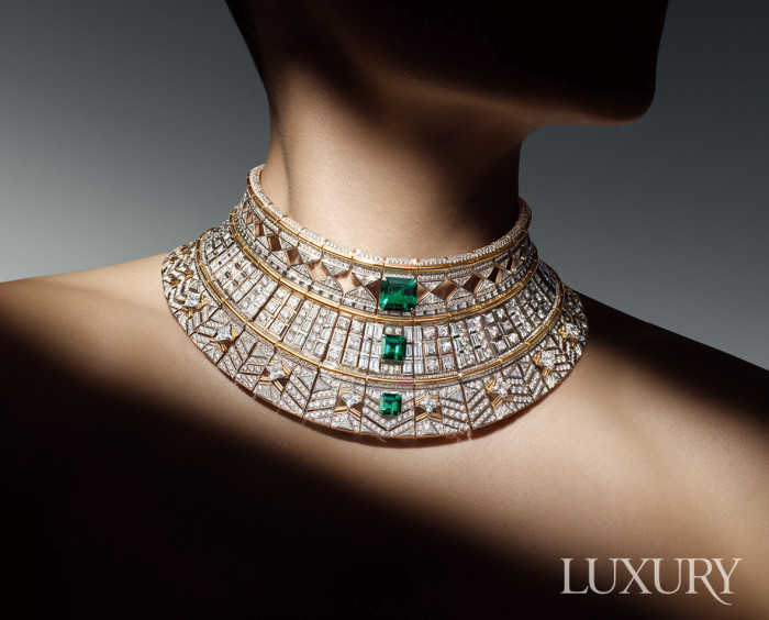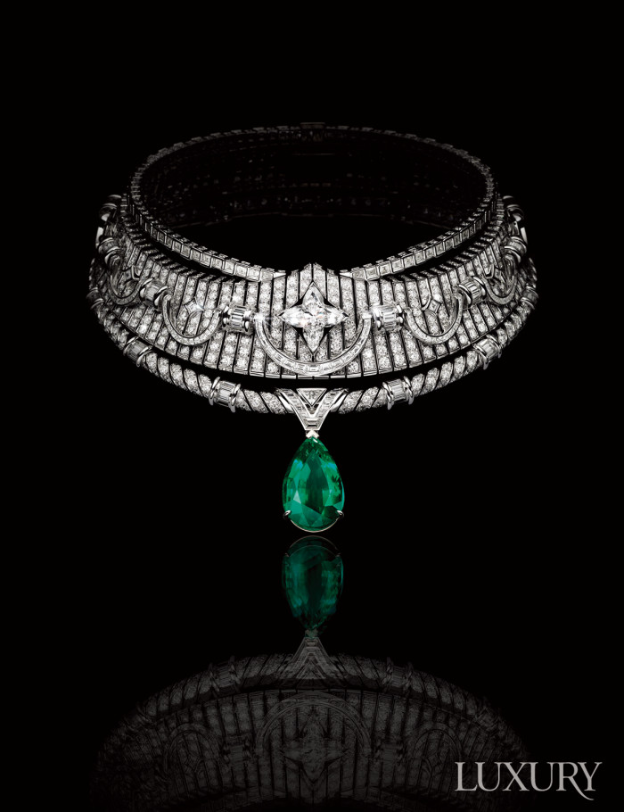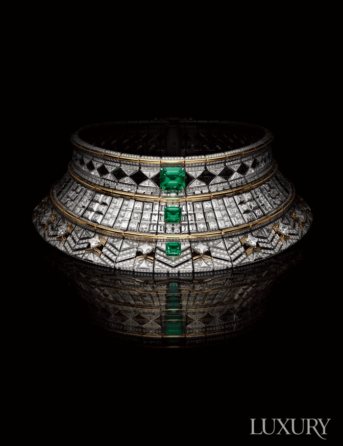 숙련도와 정밀함의 여정 ‘마에스트리아Maestria’  화이트 골드와 옐로 골드를 조합한 하이칼라 네크리스. 3개의 에메랄드가 중심에서 시선을 사로잡는다. 2500개의 다이아몬드 중 250개의 커스텀 컷 다이아몬드가 메종의 시그너처와 함께 빛난다. ‘버츄어시티’ 컬렉션의 주요 마스터피스다.