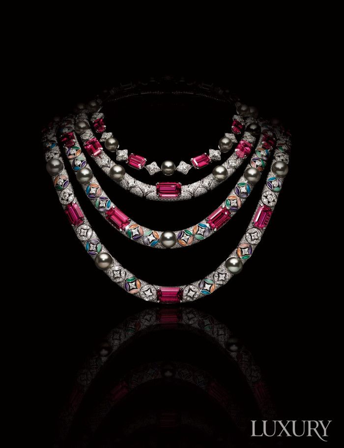 해방된 창의성 ‘아우라Aura’  창조를 통해 끊임없이 진화하는 아우라를 담은 디자인. 메종의 길잡이 별이자 끊임없이 재해석되는 LV 모노그램 플라워를 품었다. 총 48.06캐럿의 블러시 톤 투르말린과 LV 모노그램 플라워 다이아몬드가 후광처럼 번지며, 세 가지 방식으로 착용할 수 있다. 핑크, 핑크 톤 오렌지, 오렌지빛 핑크 톤 투르말린을 세팅해 여성스럽고 현대적이다.