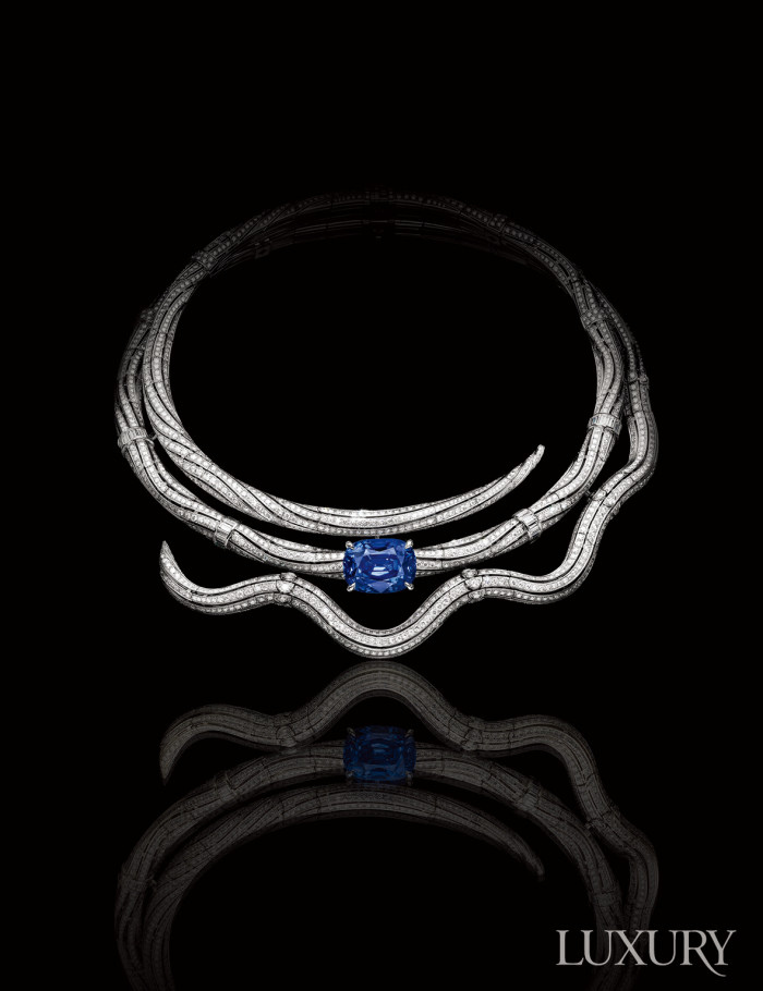 창의성의 세계를 여는 ‘모션Motion’  35.68캐럿의 스리랑카산 블루 사파이어와 파도처럼 흐르는 네크리스가 해방된 창조 에너지를 전한다. 다섯 달간 연구한 곡선형 볼륨과 브레이드 패턴은 착용자의 움직임 속에서 생명을 얻는다. 이는 ‘거장의 세계’와 ‘창의성의 세계’를 잇는 다리이자, 상상력으로 향하는 관문이다.