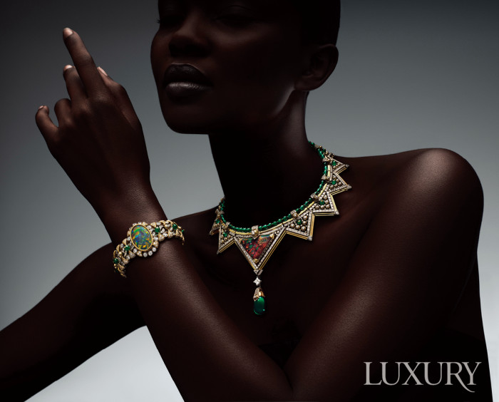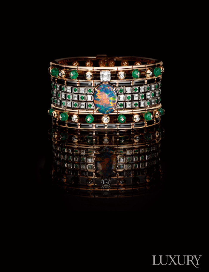 위대한 건축물 ‘모뉴멘탈Monumental’  절대적 경지에 이르고자 하는 열망을 건축적으로 표현한 작품. 8.40캐럿의 오벌 컷 오팔, 총 2.13캐럿 카보숑 컷 에메랄드, 총 8.93캐럿의 에메랄드, 총 15.45캐럿의 바게트 컷 오닉스 및 다이아몬드 세팅. 다이아몬드와 에메랄드가 그래픽적 다미에 모자이크를 만들어낸다.