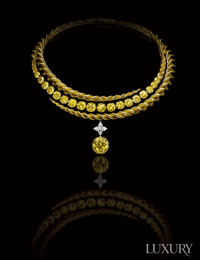 두 번째 장, ‘창의성의 세계’는 ‘모션Motion’으로 문을 연다. 블루 사파이어가 파도처럼 흐르는 네크리스로 해방된 창조성의 에너지를 전한다. ‘플로레센스Florescence’는 창조성이 만개하는 순간을 형상화하며 LV 모노그램 플라워 모티프가 추상적으로 피어오른다. ‘조이Joy’는 황홀한 색채의 향연을 펼친다. 총 204.63캐럿의 다양한 스톤들이 옐로 골드 로프 구조 속에서 유쾌한 자유와 생기를 노래한다. 이어서 ‘아우라Aura’는 블러시 톤 투르말린과 LV 모노그램 플라워 다이아몬드가 천상의 후광처럼 번진다. 여정의 대미는 ‘이터널 선Eternal Sun’이 장식한다. 7년에 걸쳐 수집한 27개의 라운드 옐로 다이아몬드와 14캐럿의 메인 스톤이 태양처럼 찬란히 빛나며 단순함 속에서 고도의 기술과 구조미를 드러낸다.