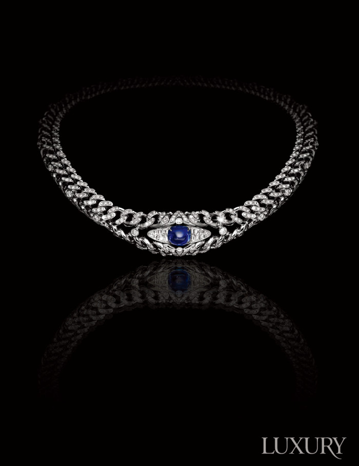 지혜를 수호하는 눈 ‘키퍼Keeper’  모든 것을 꿰뚫어보는 지혜의 눈이 방패 모티프와 함께 디자인된 네크리스. 10.12캐럿의 카보숑 블루 사파이어를 장식한 젠더리스 네크리스가 여정의 길잡이 역할을 한다. V 형태의 대담한 파베 세팅 체인은 수많은 연구와 작업 시간을 통해 볼륨감과 존재감을 극대화했으며, 트렁크 모티프가 체인을 견고하게 고정해 생동감을 더한다.
