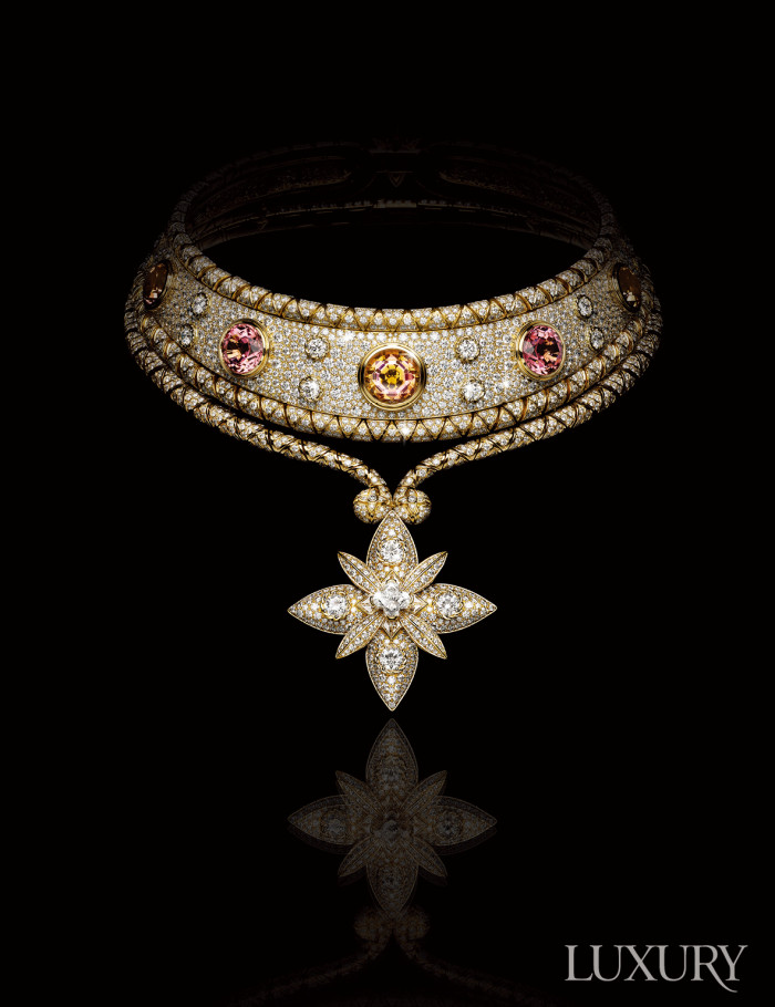 창조성의 만개 ‘플로레센스Florescence’  대담한 네 줄의 네크리스로 두 가지 컬러 테마를 선보인다. 2500시간 이상 작업해 완성되어 모두 다섯 가지 방식으로 착용할 수 있다. 메종의 시그너처 모티프를 대담하고 역동적으로 표현했다.