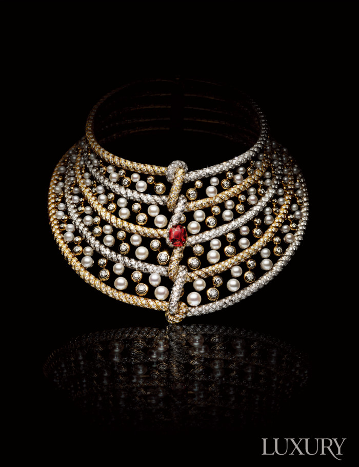 완성의 경지 ‘커넥션Connection’  2000개의 파베 다이아몬드와 114개의 진주가 로프 모티프 속에서 얽히며, 6.04캐럿의 루비가 중심에 자리한다. 이곳에서 기술과 예술은 마침내 절대적인 조화, 완성의 경지에 이른다.
