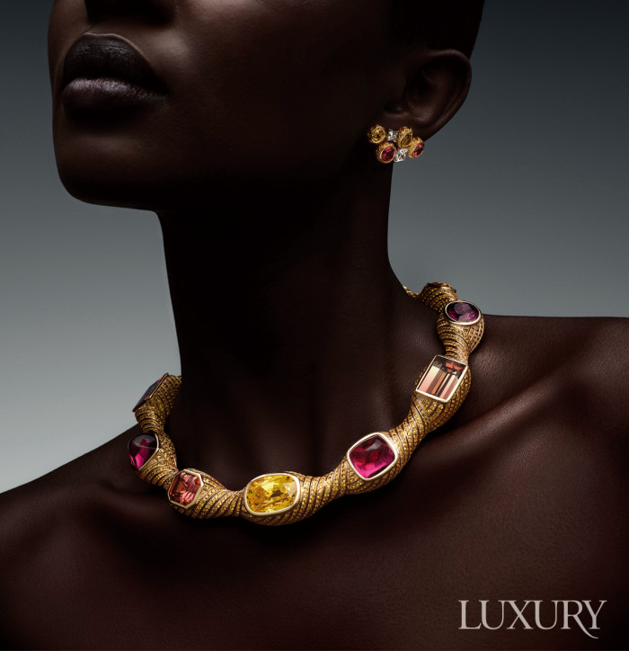 황홀한 색채의 향연 ‘조이Joy’  다양한 스톤들이 옐로 골드 로프 구조 속에서 유쾌한 자유와 생기를 노래하는 네크리스와 이어링. 스톤 하나하나가 서로 다른 높이와 형태로 세팅돼, 마치 햇살이 춤추듯 빛을 반사한다.