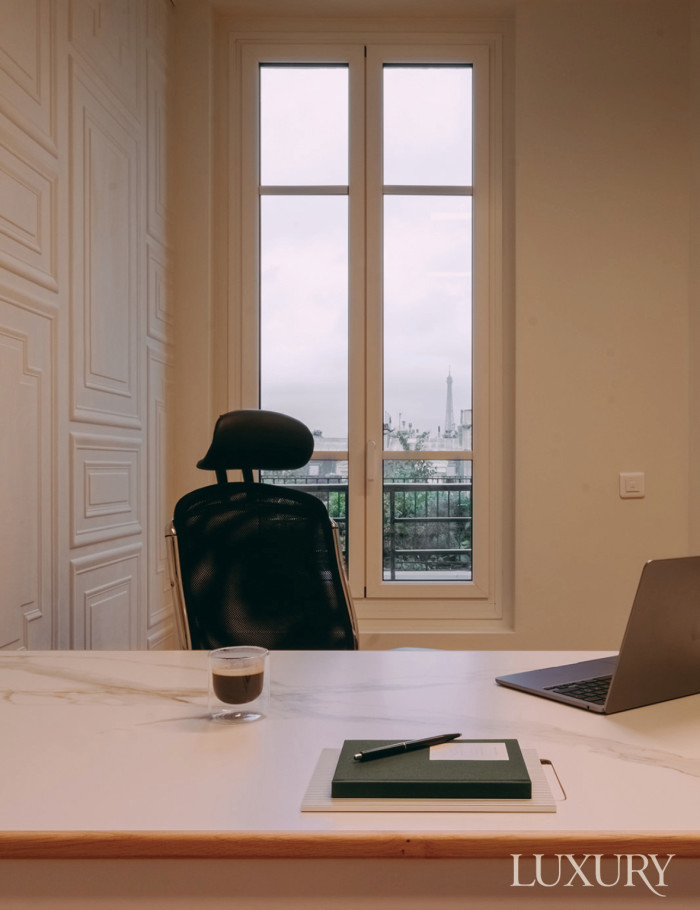 파리의 멋진 뷰와 더불어 사무실에는 로쉐 보보아와 협업해 제작한 자동 높낮이가 가능한 책상이 제공된다.