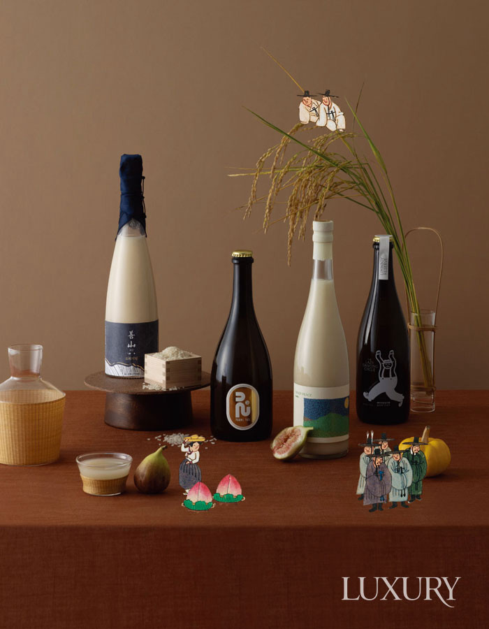 선산 오리지널 500년 전통의 경북 선산 김씨 가양주 방식 그대로 낙동강 일대에서 자란 멥쌀과 찹쌀을 사용해 옛 맛을 재현해냈다. 원주 특유의 걸쭉함과 산미가 요구르트를 연상시킨다. 서울골드 스페셜 에디션 매년 5월과 10월에 생산되는 최고급 쌀누룩을 사용해 1년에 1200병만 생산할 수 있는 한정판 술. 원주 특유의 진한 보디감과 산미를 느낄 수 있다. 이너피스 캄 상주에서 우렁이 농법으로 키워낸 100% 유기농 쌀을 사용해 만든 탁주. 은은한 민트와 딜의 아로마를 더해 편안한 기분을 이끌어낸다. 레이지댄싱서클 림보이 리저브 신촌 림보이 양조에서 빚어낸 크래프트 막걸리. 자연스러운 단맛과 풍부한 과일 향, 깔끔한 산미가 마치 내추럴 와인을 연상시킨다. 짚 주병과 짚 잔, 나무 소반은 모두 하우스오브신세계.
