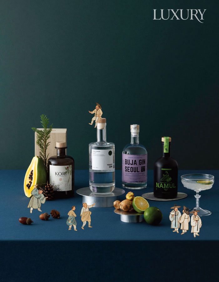 코리 진 한국 토종 노간주 열매를 베이스로 오미자, 구기자, 복분자 등 아홉 가지 한방 재료를 더해 완성한 진. 솔 향과 유자 향을 시작으로 인삼과 우엉의 보디감과 생강, 산초의 스파이시함, 복분자와 감초의 달콤함으로 이어진다. 터치 진 쌀 발효주에 25가지 보태니컬 재료를 넣어 세 번 증류시켜 완성한 진. 소나무와 허브의 청량감이 느껴지며 자연스러운 스파이시함과 부드러운 단맛, 우아하고 긴 여운으로 마무리된다. 부자진 바텐더즈 컷 30여 년간 허브를 가꾼 아버지와 아들이 경기도 양평에서 만들어낸 증류주. 청명한 솔 향과 도라지, 생강 향 뒤에 느껴지는 둥굴레의 구수함이 깊은 여운을 남긴다. 4개국 7개 국제대회의 수상 이력을 지녔다. 나물 진 반찬으로 즐기는 한국의 돌미나리, 참나물, 오이의 향긋함에 주니퍼베리의 솔 향과 유자 향이 절묘한 조화를 이룬다. 특히 칵테일이나 하이볼로 추천한다. 백동 굽접시와 트레이는 하우스오브신세계.
