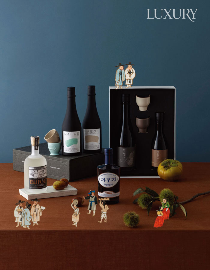오마이갓 스파클링 봄꽃 봄에 채취해 발효시킨 백목련 꽃잎과 강화도산 쌀을 사용해 만든 스파클링 약주. 잔잔한 탄산과 은은한 꽃향기가 어우러지며 2025년 대한민국 주류대상 약·청주 부문 1위를 차지했다. 한산소곡주 1500년 전 백제 왕실에서 즐겨 마셨던 술로 국내산 100% 찹쌀과 누룩, 들국화, 생강 등을 원료로 한다. 충청남도 무형문화재 제3호인 우희열 명인의 손에 의해 전통과 맥을 이어가고 있다. 일엽편주 청주 농암종택 양조장에서 전통 누룩을 이용해 600년 전 방식대로 빚어내는 술. 복숭아, 배, 사과 같은 풍부한 과실 향과 쌀의 섬세한 단맛이 어우러진다. 서설 용인 백옥쌀에 농촌진흥청과 경기도 농업기술원이 함께 개발한 토착 효모를 배양한 알코올 발효로 부드러운 과실 향이 일품인 청주. 백색 주병과 잔, 흑유 사발은 모두 하우스오브신세계.