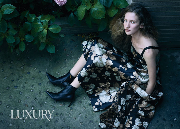 롱 재킷과 같은 패턴으로 완성한 만개한 플라워 패턴이 고혹적인 슬립 드레스, 로고를 장식한 이어링, 날렵한 토 부분이 인상적인 부티 모두 돌체앤가바나.