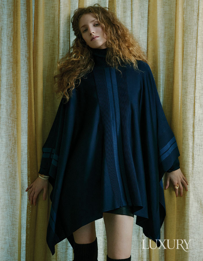 낙낙한 핏의 니트 케이프, 니하이 삭스, 레더 브레이슬릿과 편자 모티프의 링 모두 에르메스.