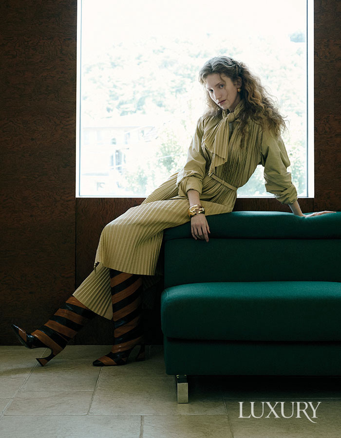 보 디테일의 네크라인과 주름 가공이 멋스러운 드레스, 스트라이프 패턴 롱부츠, 골드 스테이트먼트 뱅글과 이어링 모두 펜디.
