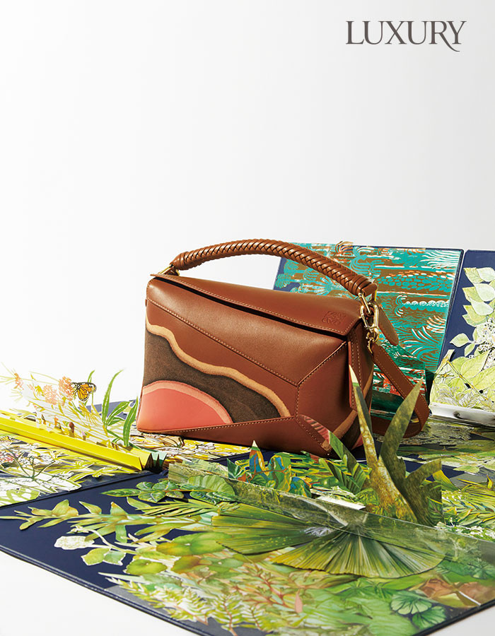 기하학적 라인과 큐브 형태가 특징인 ‘퍼즐’ 백. 싱글 스티치 라인으로 중첩되는 패널이 클래식한 구조와는 다른 매력을 선사한다. 로에베. 풀 한 포기, 나무 한 그루가 모여 이루는 숲. 익숙한 일상 속 자연을 다시 기억하도록 버려진 파일에 숲의 이야기를 재구성했다.