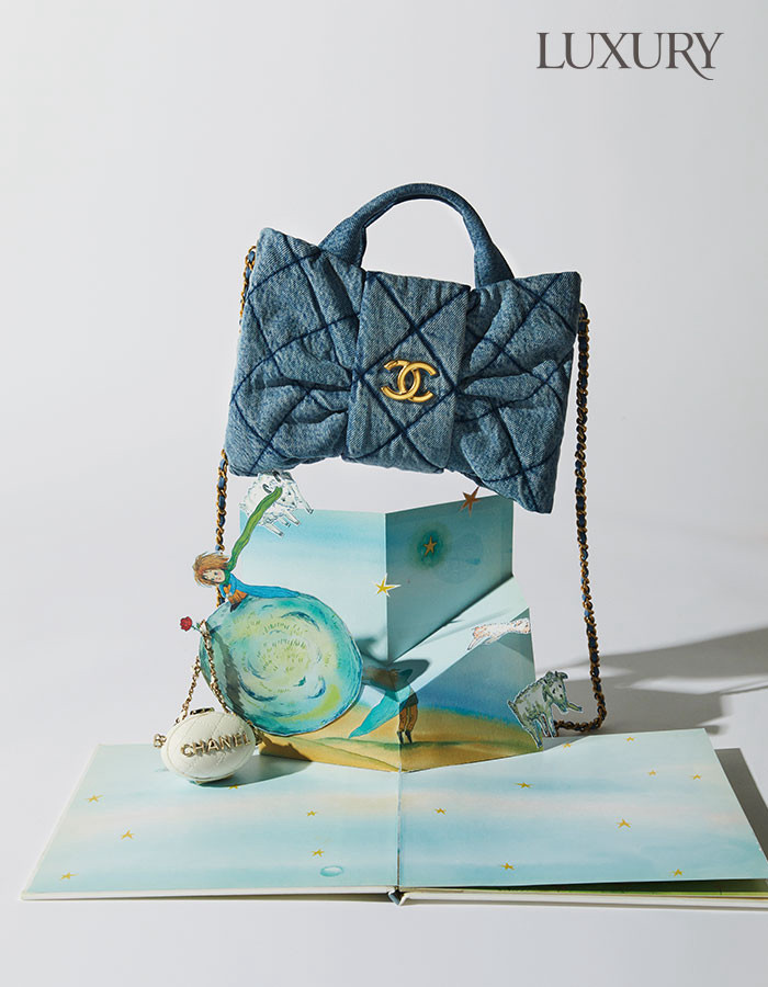 자연스럽게 워싱 처리한 데님 소재의 미니백. 리본 형태가 특징으로 골드 하드웨어를 매치해 경쾌한 무드를 선사한다. 마이크로 미니백은 백 참으로 활용할 수 있다. 모두 샤넬. 질문과 대화로 펼쳐지는 철학적 여정. 우주, 장미 그리고 또 다른 내 안의 나를 마주할 수 있는 <어린 왕자>를 팝업 북으로 제작했다.