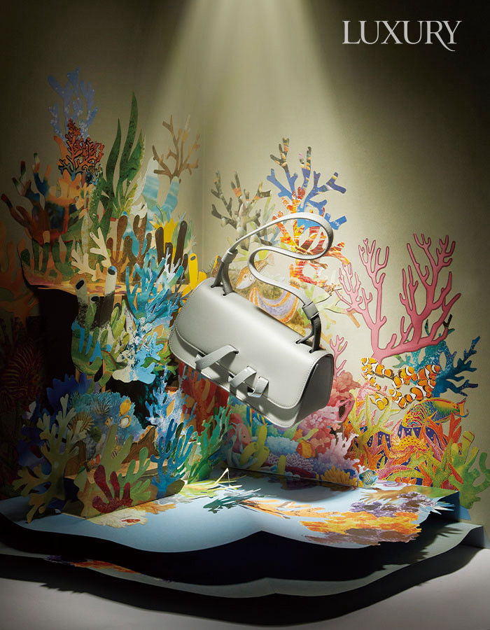 부드러운 촉감의 카프스킨 레더로 완성한 숄더백. 신발 제작 기술에서 영감받은 나선 장식이 눈길을 끈다. 테스토니. 사라져가는 바닷속 생명에 대한 경고. 산호를 주인공으로 한 창작 이야기 <산호점>을 통해 바다의 목소리를 전한다.