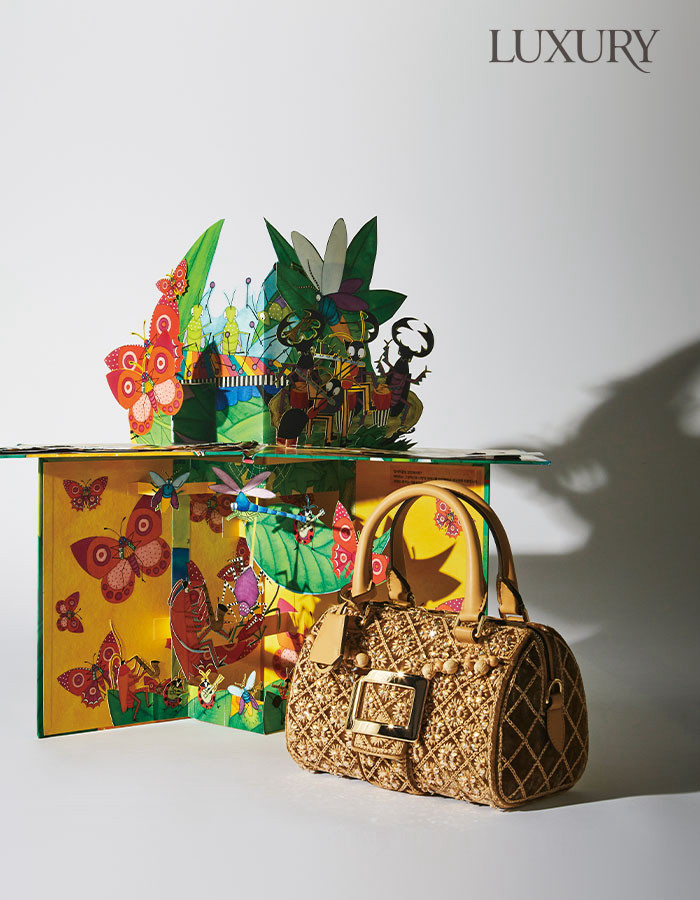 벨벳 위에 라피아, 비즈, 크리스털 자수를 더해 화려하게 완성한 ‘벨 비비에’ 백. 브랜드의 상징인 스퀘어 버클을 장식해 눈길을 끈다. 로저 비비에. 새로운 출발을 축하하는 곤충들의 연주가 펼쳐지는 음악 동화 <꼬불꼬불 칼립소 악단>. 경쾌한 리듬 속에 희망의 응원을 담았다.
