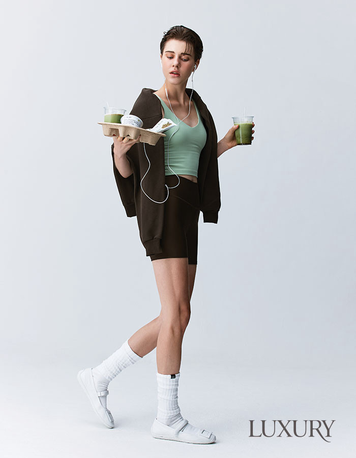 민트 컬러 브라 톱은 룰루레몬. 브라운 스웨트셔츠와 쇼츠, 화이트 삭스 모두 알로. ‘비브 로우’ 스트랩 발레리나 플랫 슈즈는 로저 비비에.