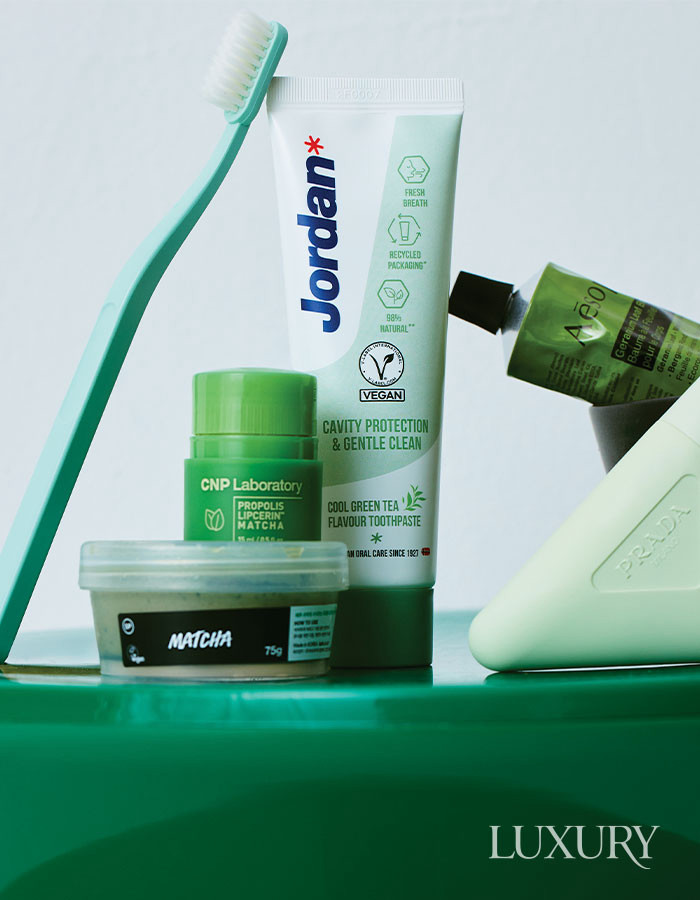 그린클린 울트라 소프트 식물성 칫솔 모와 재생 플라스틱 핸들로 만든 친환경 칫솔. 조르단. 프레쉬 페이스 마스크팩 말차 스피룰리나와 말차가 피부에 건강한 생기를 불어넣어준다. 세안한 얼굴에 피붓결이 보이지 않을 정도로 꾸덕하게 바른 다음 10분 후 미온수로 부드럽게 씻어낸다. 러쉬. 프로폴리스 립세린™ 말차 제주산 녹차 추출물이 입술 각질을 부드럽게 케어하고 산뜻한 그린 향이 힐링을 선사한다. CNP. 그린클린 치약 진한 녹차 성분이 구취를 제거하고 시원한 멘톨이 상쾌한 잔향을 남긴다. 조르단. 제라늄 리프 바디 밤 신선한 그린 시트러스 향과 실크처럼 부드러운 텍스처의 보디 밤. 이솝. 프라다 핸드 크림 전 세계 최초 한국에 선출시한 쿠튀르 핸드크림. 아이코닉한 트라이앵글 디자인이 소장 가치를 더한다. 프라다 뷰티.