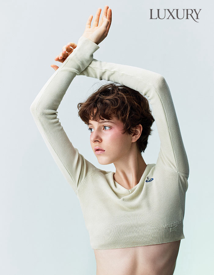 부드러운 소재의 니트 크롭트 톱은 비비안 웨스트우드.