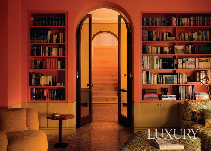 베를린을 기반으로 활동하는 디자이너 기스베르트 푀플러Gisbert Pöppler가 최근 레노베이션한 가든 홈Garden Home의 응접실 겸 서재는 단순히 책을 읽는 공간을 넘어 휴식을 겸하는 아늑한 거점으로 설계되었다. 출입구는 라운드 아치로 확장되어 시선을 부드럽게 이끌고, 동굴 같은 포근한 분위기를 자아낸다. 내부에는 핑크과 머스터드 컬러를 조화롭게 사용해 활력을 주면서도 포근함과 안락함을 불어넣었다. 책장 앞에는 푹신한 소파를 배치해 가족과 손님이 자연스럽게 머물고 대화를 나누는 공간으로 완성했다.