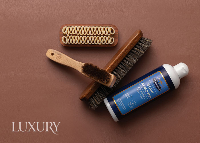 스웨이드 표면의 먼지와 오염을 제거하고 결을 정돈해주는 큰 브러시는 에도야 × 블랙샤인.