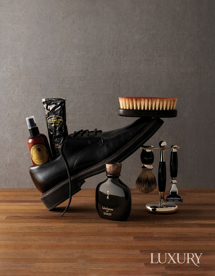 즉각적으로 수분을 공급하는 애프터셰이브 로션은 JS 슬론 by 헤아. 아보카도 오일을 함유해 면도 후 피부를 촉촉하게 쿨링해주는 ‘애프터 쉐이브 밤’은 르라보. 레이스업 슈즈는 토즈. 전통 기법으로 제작한 수제 백돈모 브러시는 에도야 × 블랙샤인. 항산화 성분을 담아 주름과 탄력을 케어하는 ‘본윤에센스’는 설화수. 영국 장인들이 수제작한 면도기, 브러시, 스탠드 세트는 트루핏앤힐.