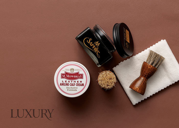 가죽에 수분과 영양을 더하는 ‘아닐린 칼프크림’은 모우브레이 by 릿슈. 가죽에 광택을 입히고 컬러를 복원해주는 ‘느와르 1925 슈크림’은 사피르 by 릿슈. 슈크림 색상에 맞추어 사용하는 말 털 약솔 브러시는 에도야 by 블랙샤인. 융과 그 위의 말 털 약솔 브러시는 콜로닐 1909 by 레더플레인.