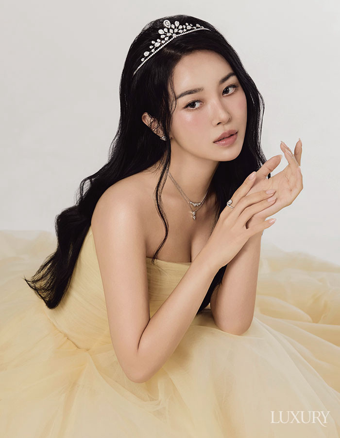 “쇼메는 나에게 첫사랑 같은 브랜드다. 프랑스 왕실의 강력한 헤리티지를 지닌 로열 블러드 하우스로서, 어린 시절 공주같은 여성스러움을 좋아하던 때부터 성인이 된 지금까지 그 가치는 더욱 깊어지고 있다. 쇼메의 티아라는 시대를 초월한 우아함과 상상력을 자극하는 아름다움을 지닌다.” 화이트 골드에 브릴리언트 컷 다이아몬드를 세팅한 ‘조세핀 아그레뜨 임페리얼 디아뎀’ 티아라, ‘조세핀 아그레뜨’ 링, ‘조세핀 아그레뜨’ 이어링, 2개를 레이어드한 ‘조세핀 롱드 다그레트’ 네크리스 모두 쇼메. 옐로 드레스는 르블랑.