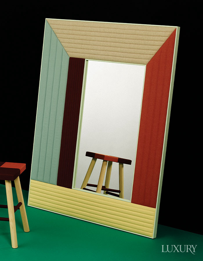 오렌지, 아이스 블루, 베이지 그레이, 옐로 컬러를 조합한 캐시미어 소재 솜 누비 퀼팅 미러, 불카프스킨과 애시 우드 소재의 작은 사이즈 스툴 모두 에르메스.